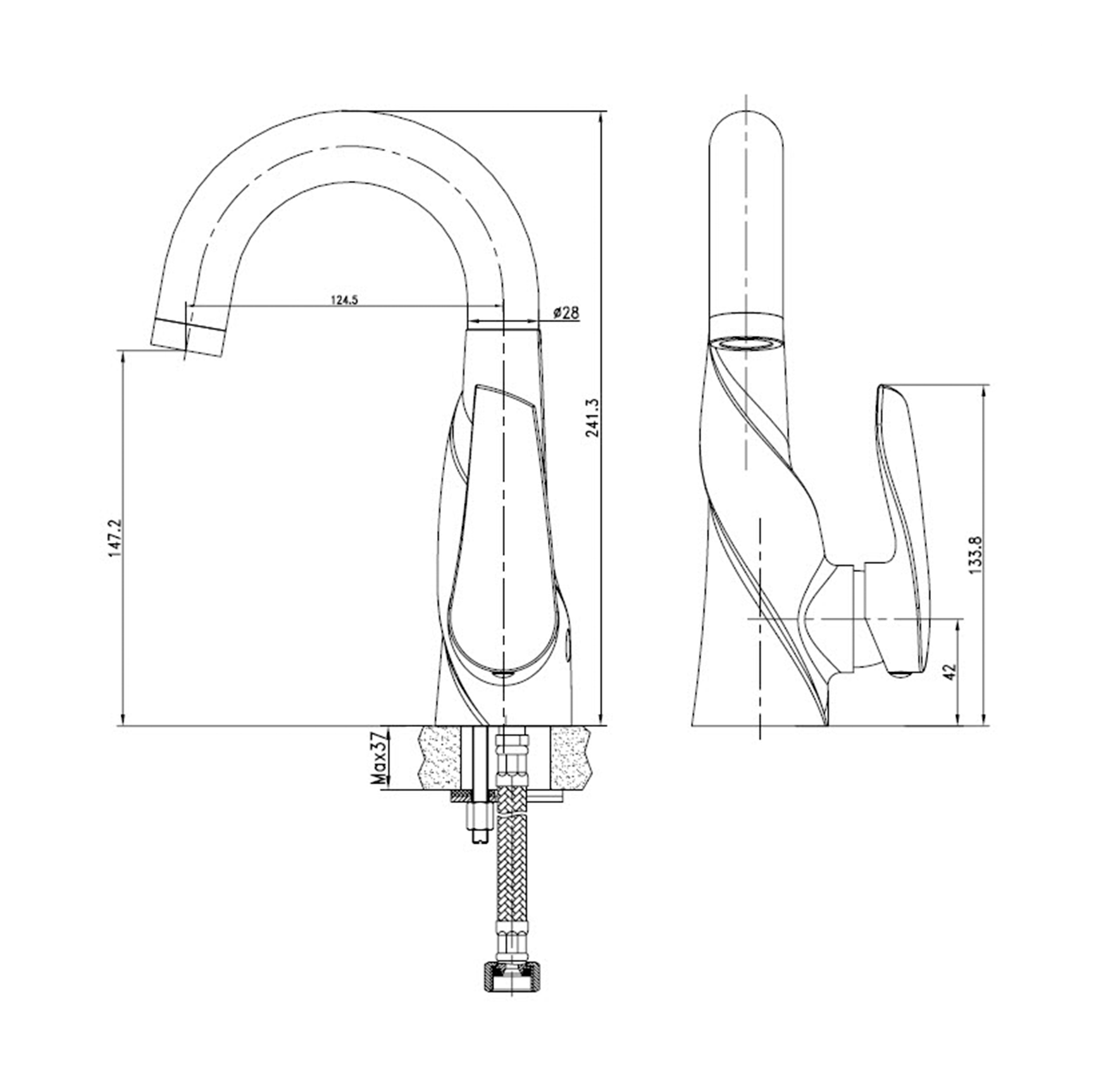 מידות: גובה 24.1 ס”מ | מרחק הפיה מגוף הברז 12.4 ס”מ.