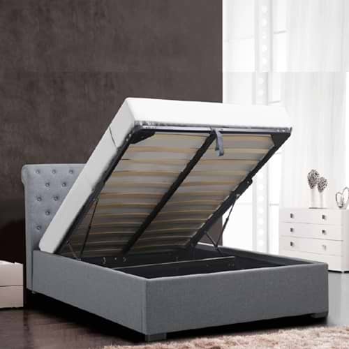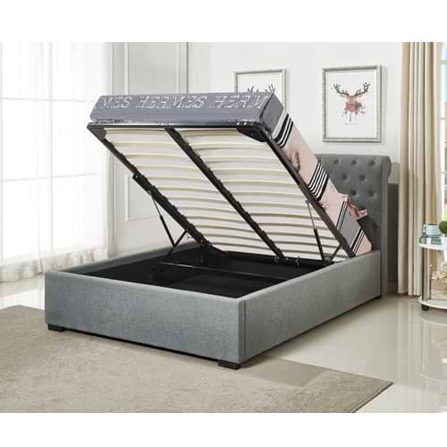ארגז מצעים מובנה, מרווח, מתרומם מחזית המיטה, עם מנגנוני בוכנות להרמה קלה ונוחה כמוצג בתצלום.