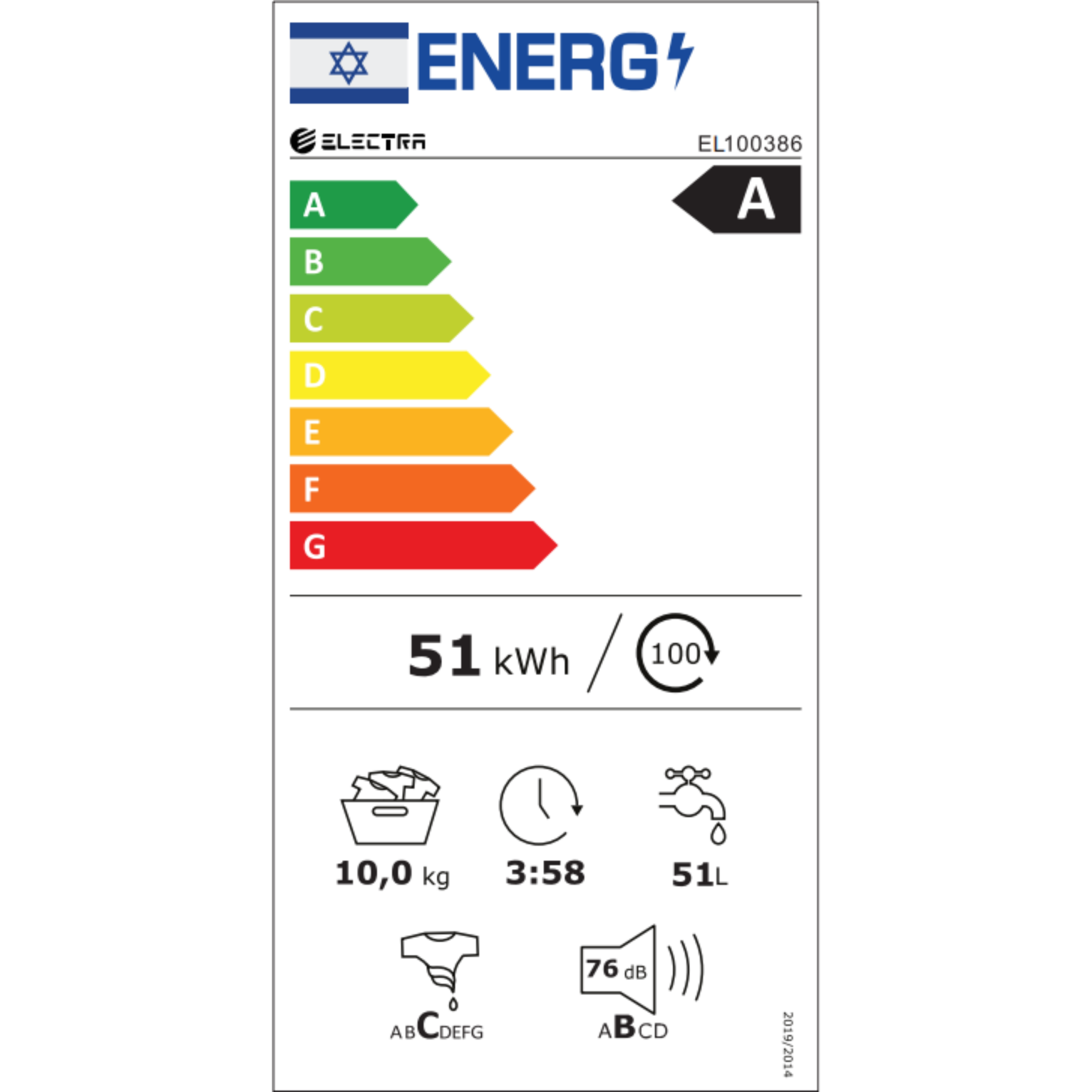 מכונת כביסה חזית 10 ק"ג Electra EL100386 אלקטרה במהירות 1400 סל"ד צבע שחור