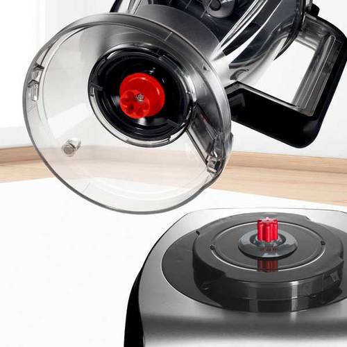 קערה שקופה בנפח ענק של 3.9 ליטר עם פתח הזנה רחב ודוחסן כפול המשלב מדיד כמויות ומאפשר החדרת ירקות בצורה אנכית.