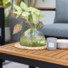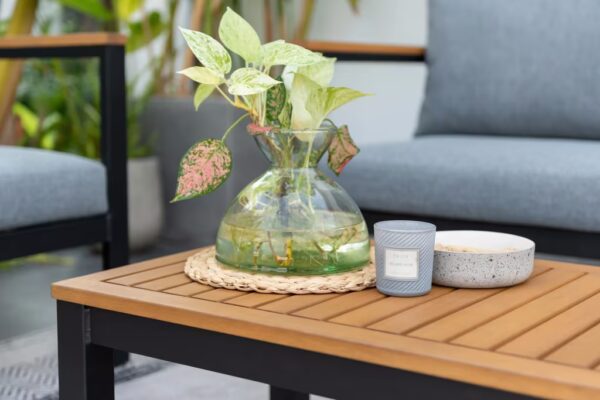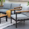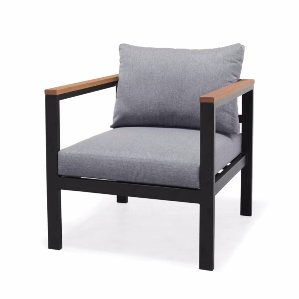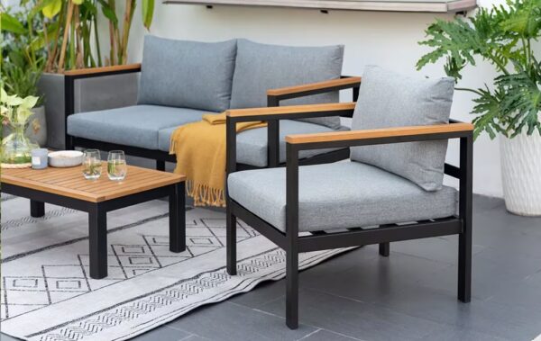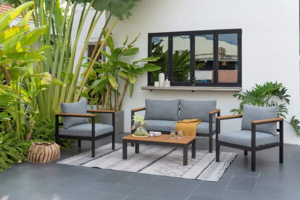 מערכת ישיבה מעוצבת לגינה או למרפסת משולבת אלומיניום ועץ. הסט כולל הכולל ספה דו-מושבית, שתי כורסאות ושולחן קפה.