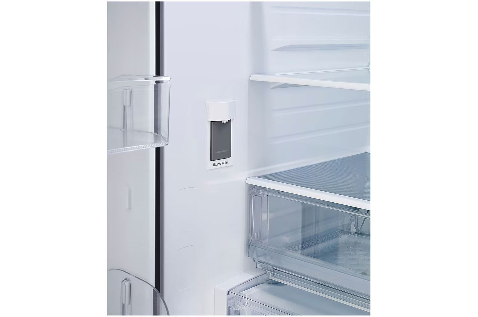 בר מים מסוננים דיסקרטי הבנוי בתוך גוף המקרר לחיסכון במקום.