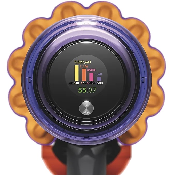 הוכחה מדעית לניקיון יסודי: צג LCD בראש השואב מציג את כמות וסוג החלקיקים הנשאבים, כהוכחה מדעית לכך שהבית נקי באופן יסודי